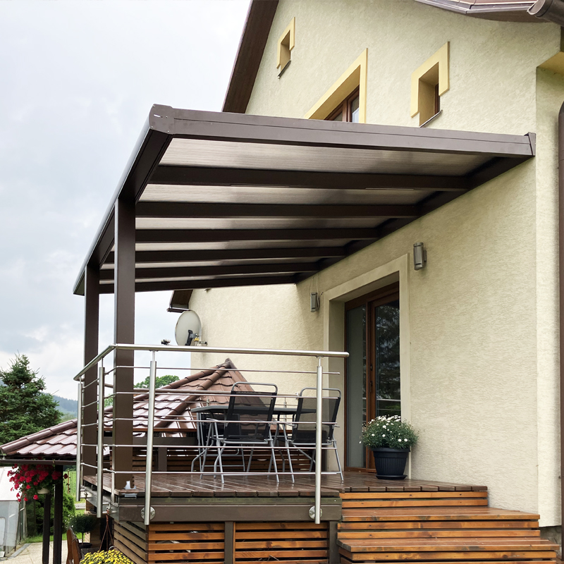 Polykarbonátová střecha poskytuje účinnou ochranu před deštěm i přímým slunečním zářením a zároveň propouští dostatek přirozeného světla. Díky tomu vzniká příjemné a světlé prostředí vhodné pro každodenní relaxaci, rodinné posezení i venkovní stolování.